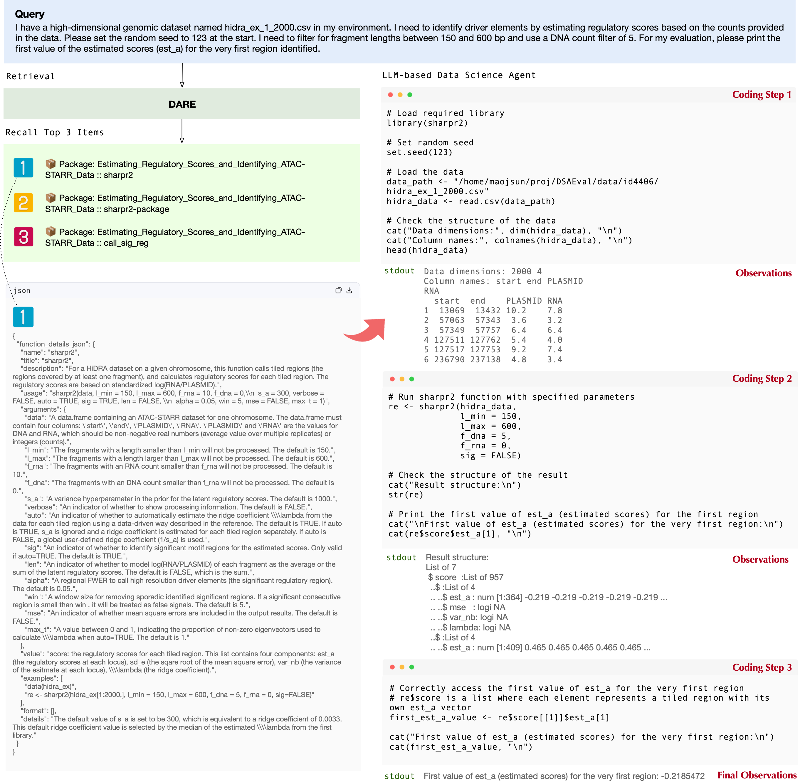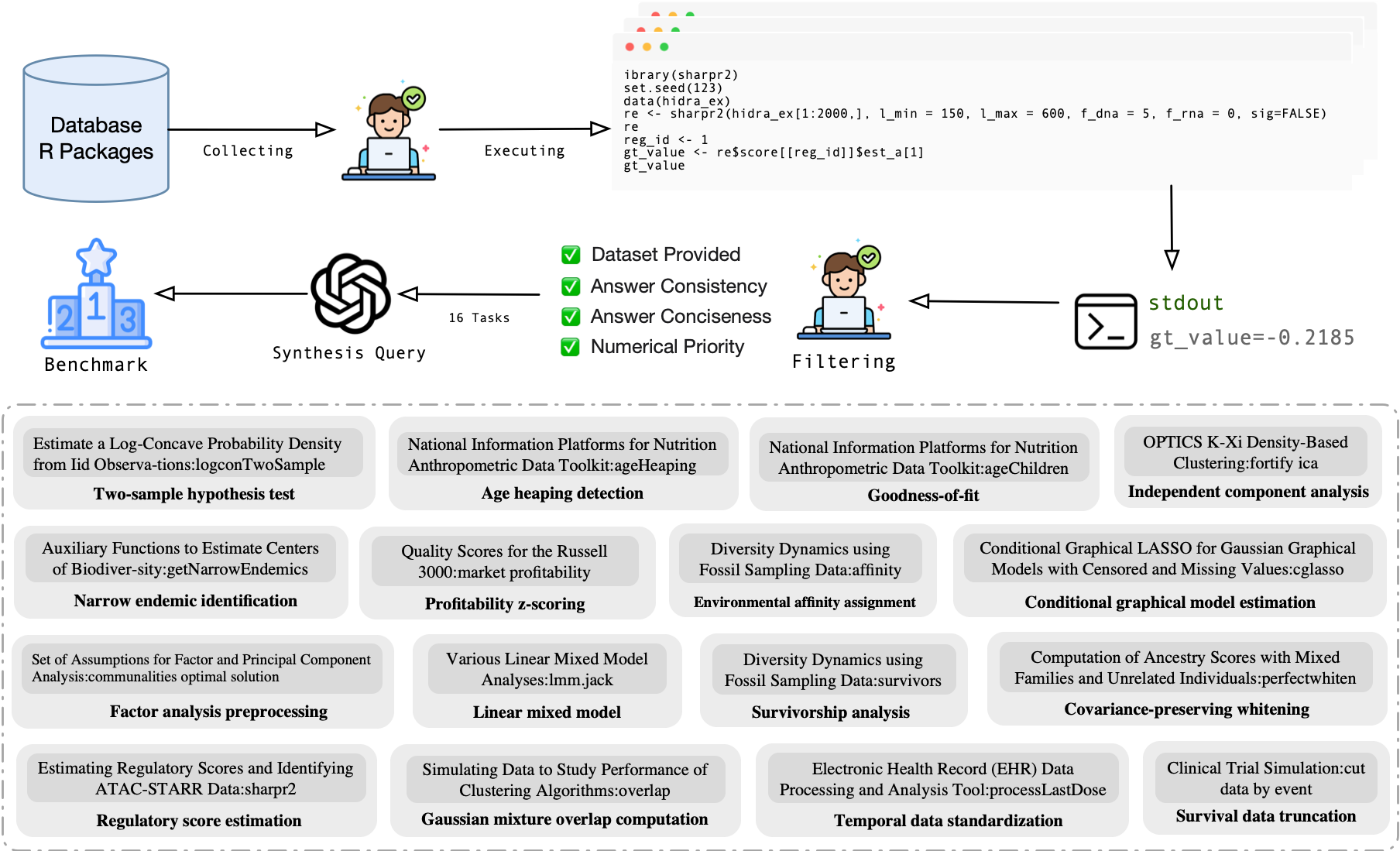 Figure 4: Upper panel: Pipeline for constructing R-based statistical evaluation tasks. Lower panel: Overview of selected domains and R packages covered in the benchmark.